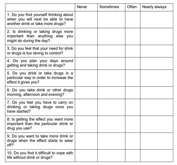 To help you assess your situation, we provide the Leeds Dependency Questionnaire (LDQ) and AUDIT-C screening tools. You can complete these self-assessment tools to get an idea of whether you might benefit from support from Barnsley Recovery Steps (BRS).